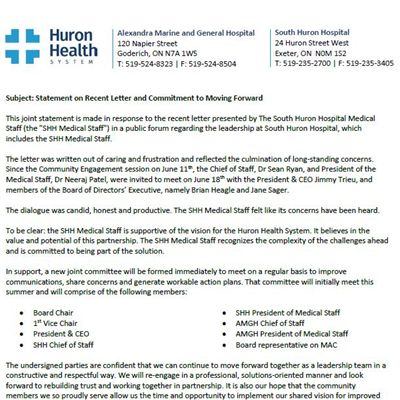 This joint statement is made in response to the recent letter presented by The South Huron Hospital Medical Staff (the "SHH Medica...